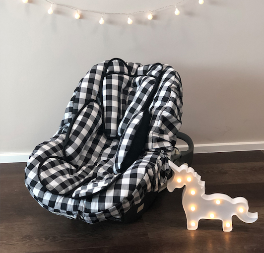 Protetor de bebê conforto, acolchoado e 100% algodão. Dupla face, pode ser usado de ambos os lados: estampa Xadrez PB ou Preto liso.